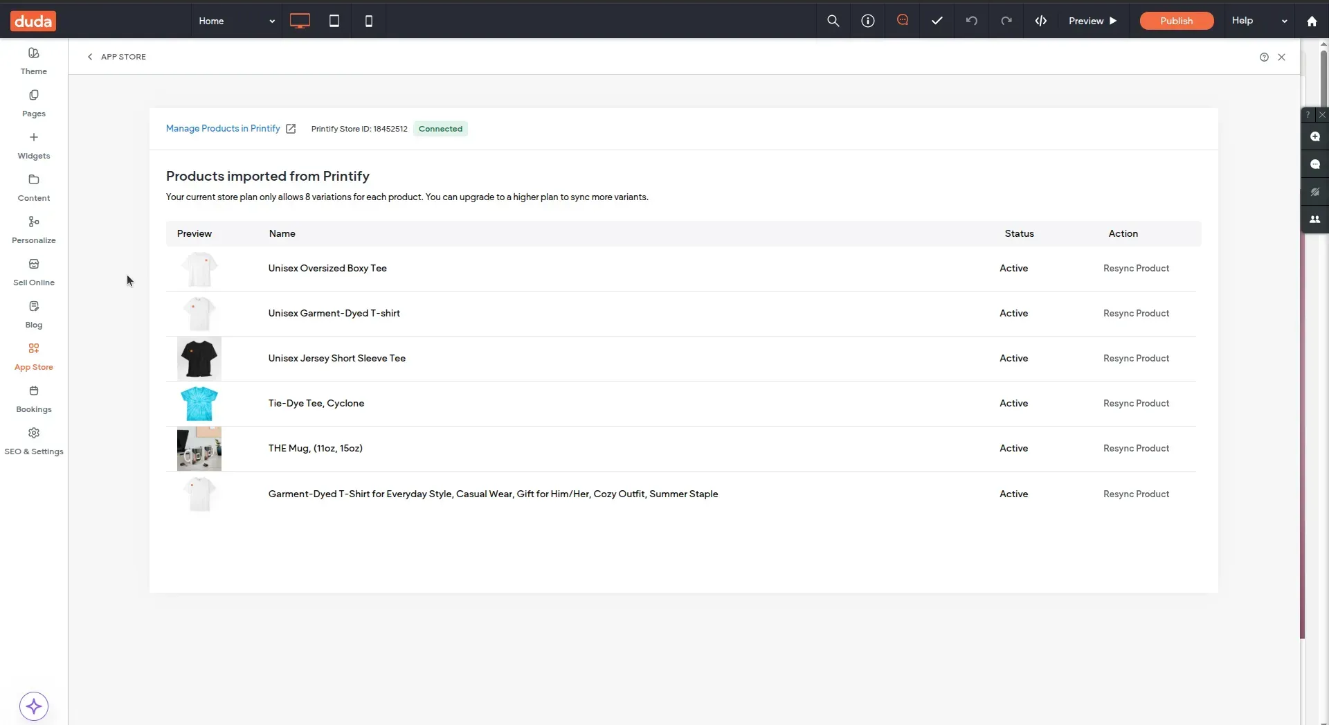 - Automated product sync – Products published in Printify automatically appear in your store, including images, prices, and variants.